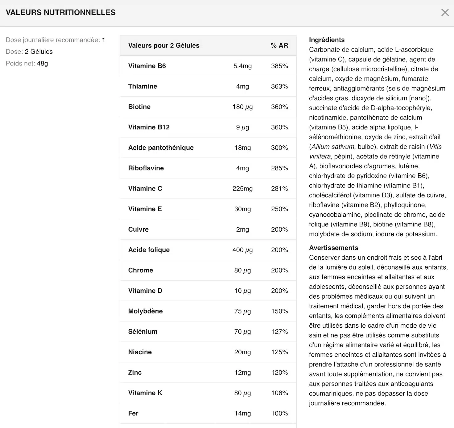 • 23 vitamines et minéraux clés : dont folates (600 µg), fer (18 mg), calcium (150 mg), vitamines A, C, D, E, K, B‑complexes, zinc…